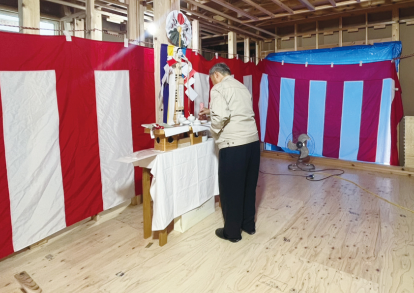 棟上げが終わった現場にお施主様、大工さん、ハウ・ツゥ・ライブスタッフが集まり、工事の安全を祈願します。