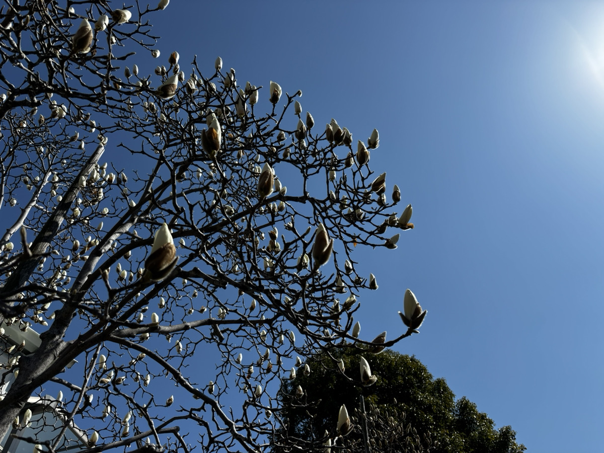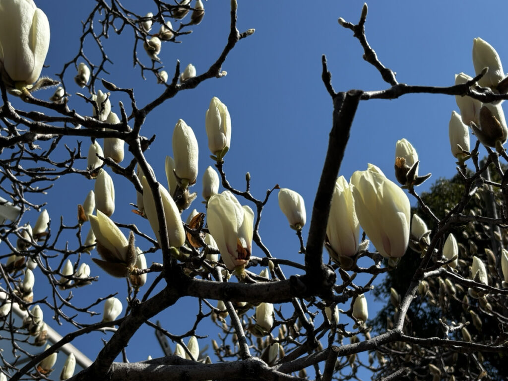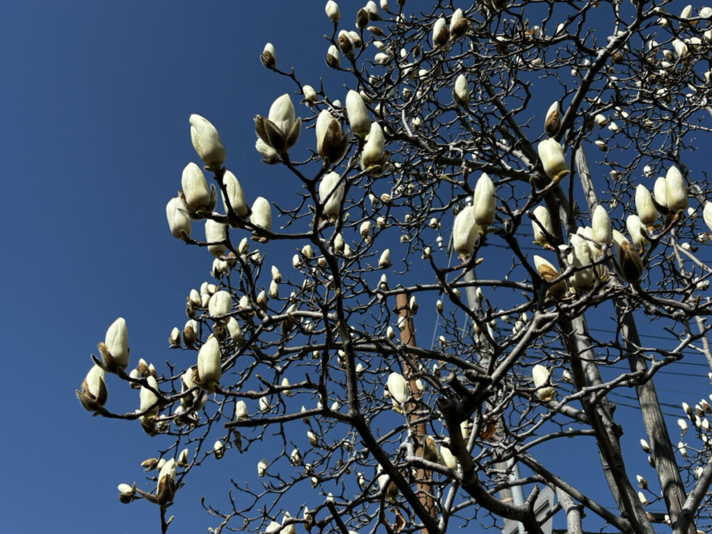 散歩していると、ハクモクレンが咲き始めていました。