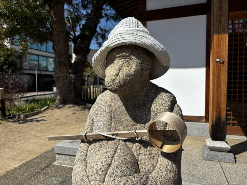 そして神社の神猿さんには、だれかが日よけの帽子を