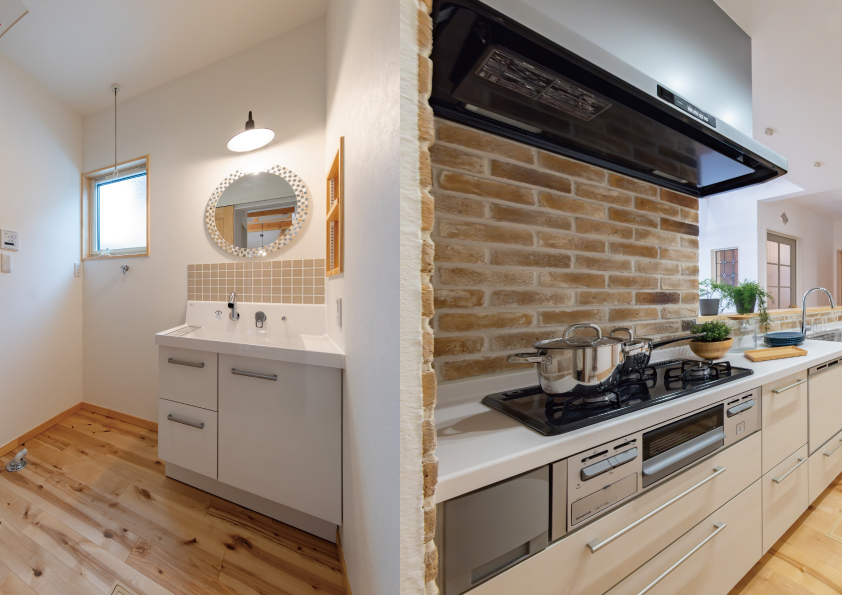 既製品の使いやすさと、丸鏡やライトのデザイン性を両立。キッチンのブリックタイルは、美しさを保ちながら「掃除の負担を減らす」プロの知恵です。