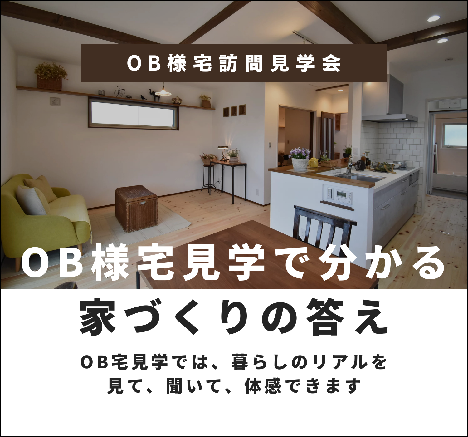 完成直後ではなく、実際に住んでいるOBさまのお家を見学します。暮らしのリアル(動線・収納・使い勝手)を体感でき、OBさまに質問もできます。